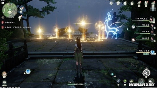 在我御剑从苏州飞往杭州的过程中,看到了一棵虚幻的大树,被奇景吸引并驻足前往的我,被一只虚幻的光鹿带到了一座绝壁之上。随着我走过山上的石门,一座石桥突然出现跨越云海,指引我前往几座不同的山峰,同敌人战斗、在云海间跳跃、在山间找出与某个卷轴相似的奇景。最终修复了七柄残剑,获得了丰厚的奖励。
