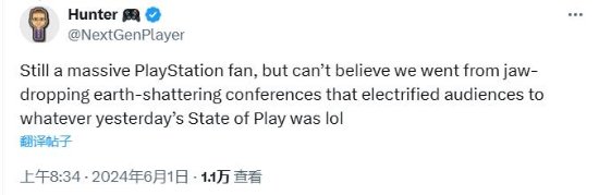 博主@NextGenPlayer表示:“我依然是PlayStation的超级粉丝,但真不敢相信我们从那些让人惊叹、震撼的发布会,变成了昨天那样的State of Play。”
