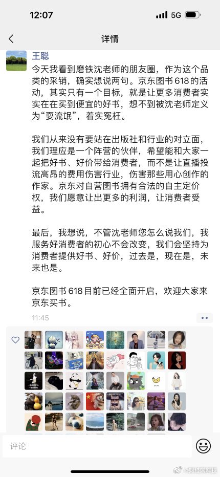 对此,京东图书采销员工在朋友圈回应称:“京东图书618的活动,从来没有要站在出版社和行业的对立面,我们理应是一个阵营的伙伴,希望能和大家一起把好书、好价带给消费者,而不是让直播投流高昂的费用伤害行业,伤害那些用心创作的作家。京东对自营图书拥有合法的自主定价权,我们愿意让出更多的利润,让消费者受益。”