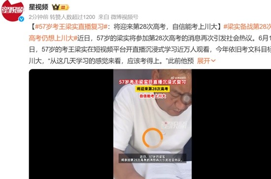 据星视频报道,近日,57岁的梁实将参加第28次高考的消息再次引发社会热议。