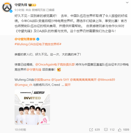 《守望先锋》官博又活了!宣布赞助中国队伍参赛