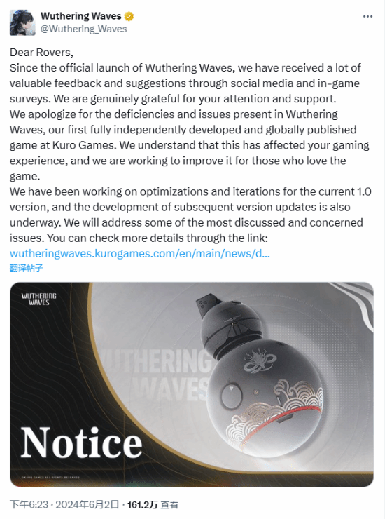 昨日,《鸣潮》官方再次对《鸣潮》公测开启后的表现向国内的玩家表达了歉意,并表示将会给予玩家补偿。随后,《鸣潮》官方也将这一篇声明发到了X平台,该篇声明引起了玩家的热议,我们一起来看一下。