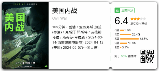 《美国内战》即将于6月7日在中国内地正式上映,官方此前也放出了中国内地的终极预告,且IGN为该电影打出了9分的高分。截至发稿前,《美国内战》在豆瓣的评分为6.4分,共有26035人参与了评价,其中给予4星与3星的观众居多,分别占比26.4%与43.8%。