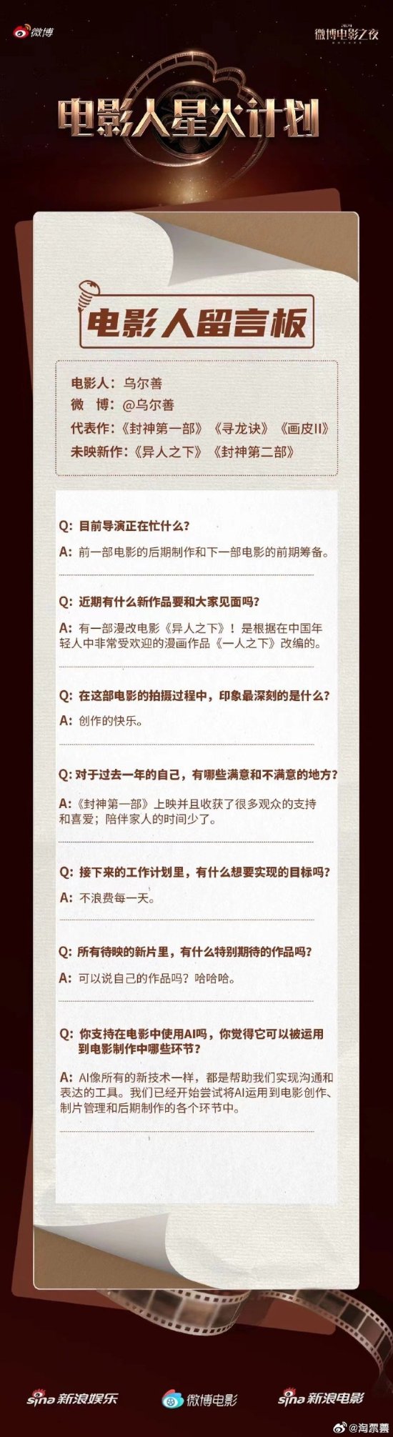 淘票票消息,在今年的微博电影之夜活动中,著名导演乌尔善通过“电影人留言板”与观众分享了他最近的工作进展。
