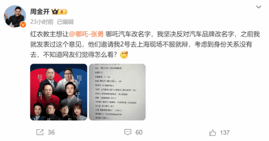 日前,上汽五菱品牌副总经理周金开发文称,红衣教主想让哪吒CEO张勇对哪吒汽车改名字,我坚决反对汽车品牌改名字。周金开表示,之前他就发表过这个意见,他们邀请他去上海现场不服就辩,考虑到身份关系才没有去。