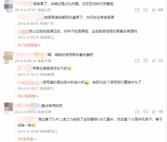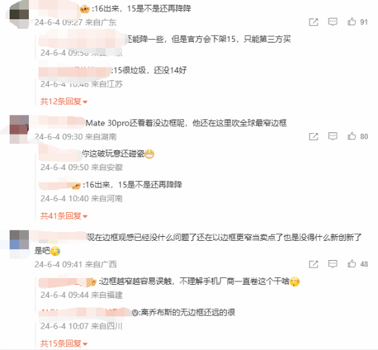 网友们对此也展开了讨论。有网友表示:“现在边框观感已经没什么稀奇,苹果却还在以边框更窄当卖点,也是没什么新创新了。”还有网友认为,苹果应该在续航、散热、高刷、快充等一系列技术上下功夫,而不是仅限于外观。