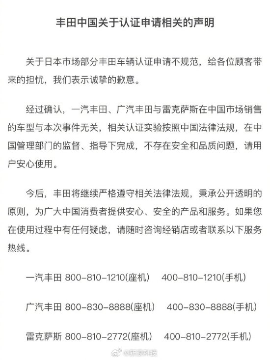 广汽丰田官微发布《丰田中国关于认证申请相关的声明》,其中指出:关于日本市场部分丰田车辆认证申请不规范,给各位顾客带来的担忧,我们表示诚挚的歉意。