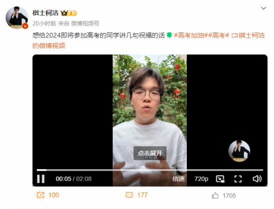 日前,知名围棋棋手柯洁发布视频,对2024即将参加高考的同学讲了一些祝福的话。