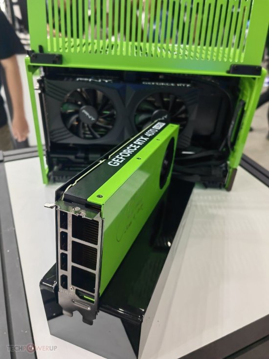 不同于单调的黑色配色方案,PNY的这款显卡色彩非常亮丽,整个外壳都覆盖着绿色。该卡采用了SFF小尺寸规格以及侧吹鼓风式的散热方案。这款显卡获得了黄仁勋的称赞,他还在上面签了名留念。