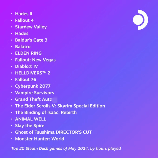 5月Steam Deck掌机最受欢迎的20款游戏公布,《哈迪斯2》登顶,《辐射4》第二。一起来看看大家都在玩什么吧!