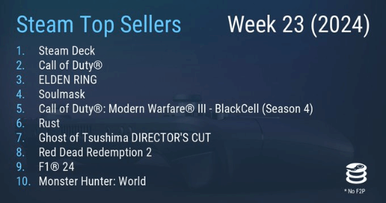 新一期Steam周销榜公布,Steam Deck掌机二连冠,《艾尔登法环》热度不减。上周两款新作《灵魂面甲》和《F1 24》分位列第四和第九。