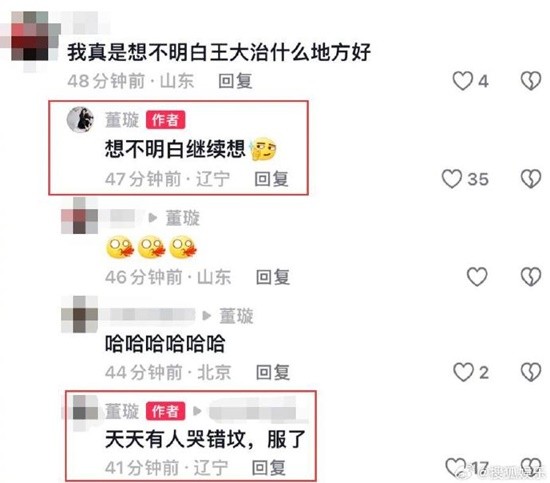有网友去董璇评论区留言:“真是想不明白王大治什么地方好”,董璇回复:“想不明白继续想。”她还忍不住在评论区向粉丝吐槽:“天天有人哭错坟,服了!”