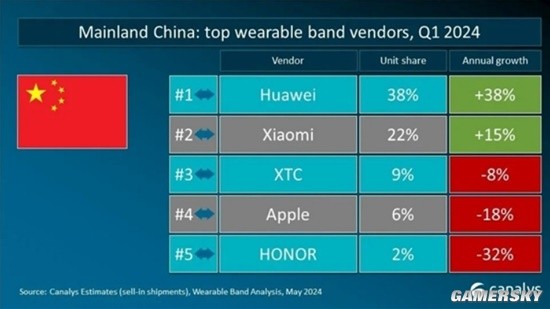 根据市场研究机构Canalys的最新数据,在2024年第一季度,小天才在中国大陆可穿戴腕带设备市场的份额为9%,仅次于华为和小米位居第三。