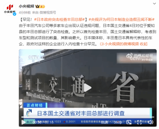 央视财经报道,由于丰田汽车公司等多家车企出现认证违规问题,日本国土交通省4日对位于爱知县的丰田总部进行了突击检查。