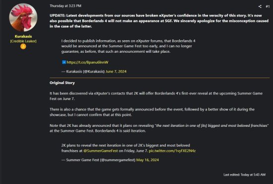 目前,知名泄密者Kurakasis在Exputer对自己先前对《无主之地4》的爆料进行了改口,表示《无主之地4》也有可能不会出现在今年的夏日游戏节上,并对自己产生的误导感到抱歉。