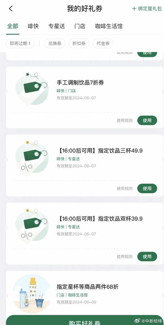 据中新经纬报道,近期,有不少消费者对记者透露,自己的星巴克app多出了许多限时优惠券,其中包括三杯49.9、双杯39.9、单杯7折券等,平均下来每杯的价格仅有20元,比起此前一杯动辄40、50的价格,如今的星巴克显得格外亲民。