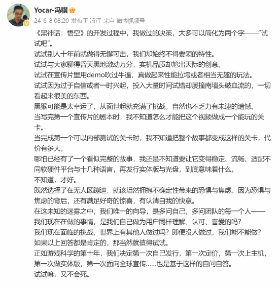游戏科学的制作团队在过去的几年里,凭借着勇于挑战和不断试验的精神,逐步打造出这部备受瞩目的作品。游戏制作人冯骥也在社交媒体上分享了他在《黑神话:悟空》开发过程中的心路历程。