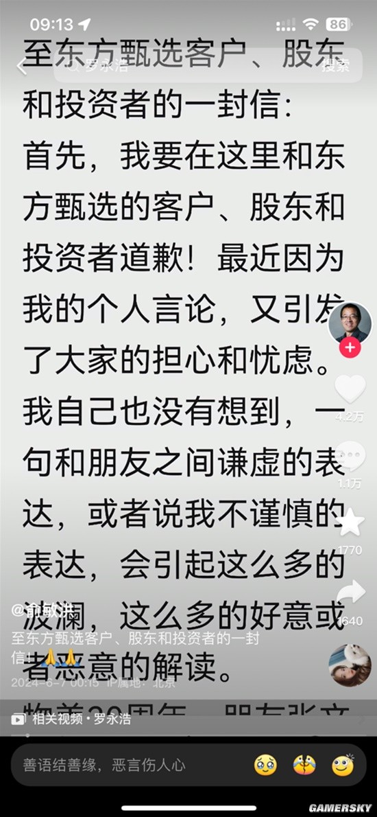 6月7日凌晨,新东方创始人俞敏洪发布长文,就对近日在直播中发表的“东方甄选做得乱七八糟”“后面会稍微远离生意,不喜欢在生意中打拼了”等争议言论,进行了回应。
