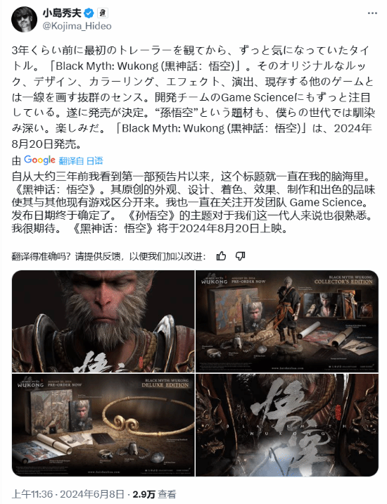 小岛秀夫期待《黑神话:悟空》:展现了卓越创意与美感