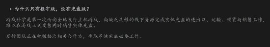 “游戏科学是第一次面向全球发行主机游戏,尚缺乏足够的线下资源完成实体光盘的进出口、运输、铺货与销售工作,难以在游戏正式发售同时销售实体光盘。发行团队正在积极接洽相关合作方,争取尽快完成必要工作。”