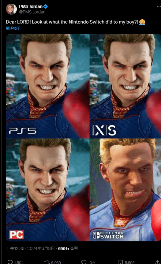 推主PMS_Jordan发布了一张图片对比NS版本与PS5、XSX|S以及PC版本的画面,后者相当还原《黑袍》剧版中的祖国人形象,而NS版本则几乎看不出来二者有何关联,细节和纹理都比较糟糕。这条推文也道出了玩家们的心声,点赞数超过了10万+。