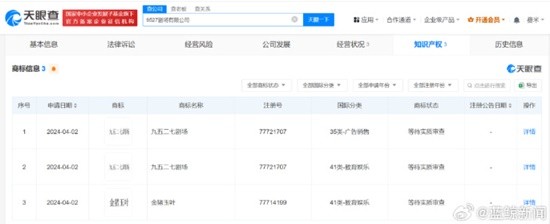 天眼查知识产权信息显示,9527剧场有限公司已申请注册1枚“金猪玉叶”商标,国际分类为教育娱乐,当前商标状态为等待实质审查。