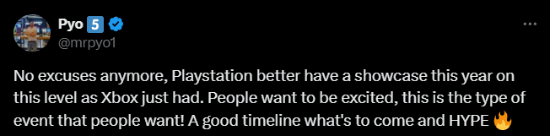 推主mrpyo1发文表示:“PlayStation这边不能再找任何借口了,他们今年最好能像Xbox一样展示出这样精彩的水平。人们喜欢令人兴奋的东西,这就是人们想要的发布会类型!里面展示了太多值得期待的内容。”