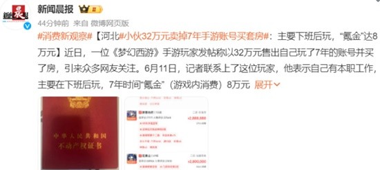 据新闻晨报报道,近日,一位《梦幻西游》手游玩家发帖称以32万元售出自己玩了7年的账号并买了房,引来众多网友关注。