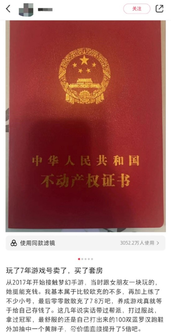 小伙32万元卖掉7年游戏账号买套房 "氪金"达8万元