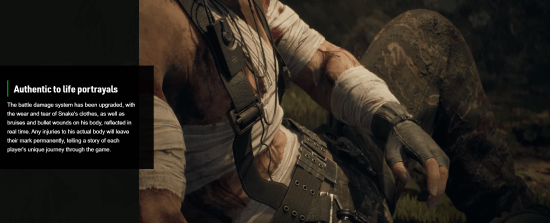 “战斗伤害系统已经升级,Snake衣服的磨损,以及他身上的瘀伤和枪伤,都会实时反映出来。他身体上的任何伤害都会留下永久的印记,讲述每个玩家在游戏中的独特旅程。”