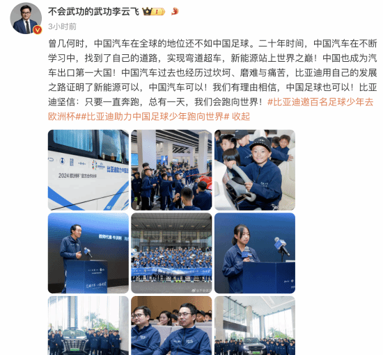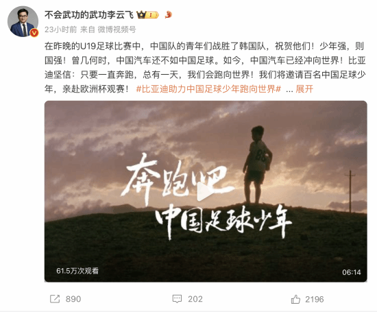 日前,比亚迪集团-品牌及公关处总经理李云飞发文表示,在U19足球比赛中,中国队的青年们战胜了韩国队,祝贺他们。