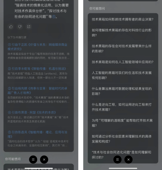 此外,AI还会整理书籍引源,习惯归类阅读的用户有福了。通过用户提问,AI还会进一步预设问题,学习知识可以像剥洋葱一样层层深入,但毫不费力。