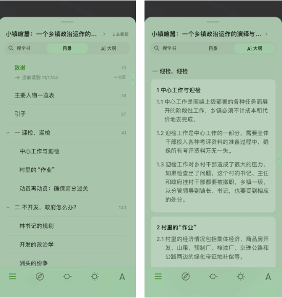 “AI大纲”更是直接改造原文目录,能够简化长篇文章的结构,便于用户快速把握重点,简明扼要的了解对应章节讲述的内容。这一功能非常适合快速阅读的书本。