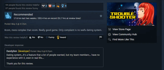 有玩家在社区评论称,这是一款非常好的游戏,比《幽浮》更加复杂,唯一的缺点是没有约会系统。对此,开发商Dandylion解释了原因。