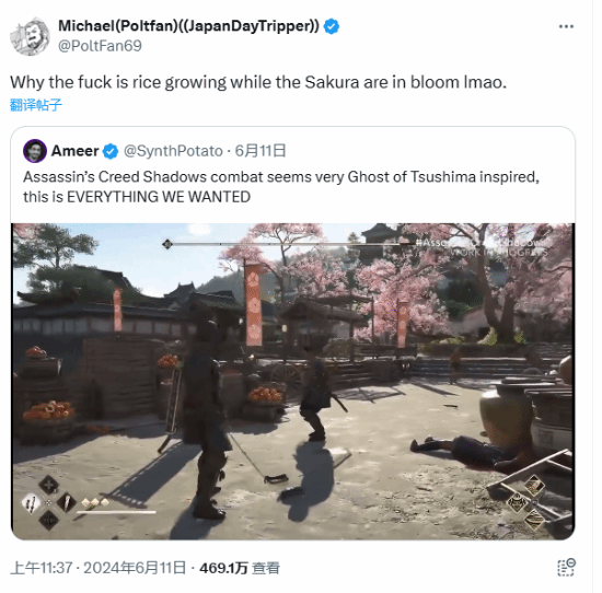 玩家质疑《AC影》环境真实性:樱花盛开水稻还在长?