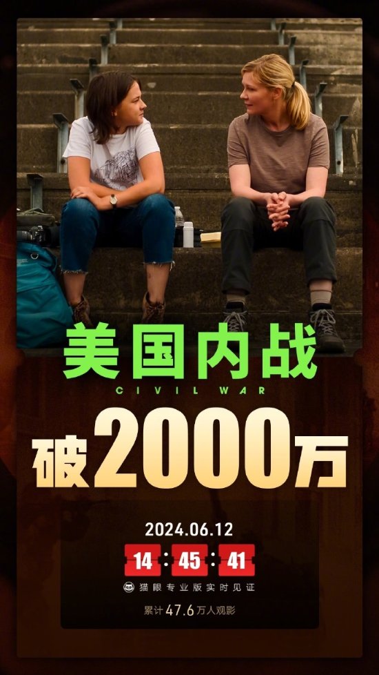 据猫眼专业版实时数据显示,今日是A24动作巨制《美国内战》正式在内地上映的第六天,总票房已经突破了2000万!