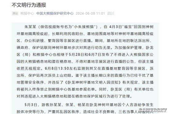 为加强保护管理,卧龙区(局)和熊猫中心也相继于5月28日和6月7日发布了不得进入大熊猫国家公园的大熊猫栖息地和潜在栖息地、不得对基地非展区进行直播的公告,但该主播依然无视规定。