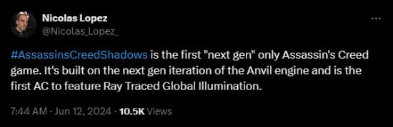 育碧引擎技术架构师Nicolas Lopez在社交媒体上为《刺客信条:影》宣传造势,他宣称这款即将推出的潜行动作游戏是该系列的首款“仅登次世代”作品。