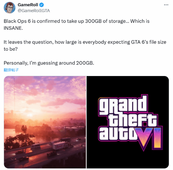 在本次的Xbox发布会上,《使命召唤21:黑色行动6》公布了诸多情报,且游戏在Xbox商店上显示的占用空间超300GB。尽管动视官方后续对游戏容量的组成部分做出了解释,但仍有玩家对未来游戏的容量感到好奇。近日,有玩家根据此事在X发推猜测《GTA6》的容量,我们一起来看一下。