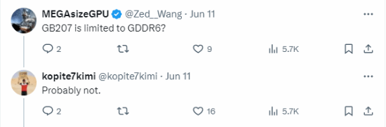 Kopite7kimi也表示,GB207 “多半”(Probably)不仅支持GDDR6显存。因此MEGAsizeGPU认为,基于GB207核心的桌面端显卡将仅使用GDDR6,但对应的移动端显卡则仍将更新到GDDR7显存。