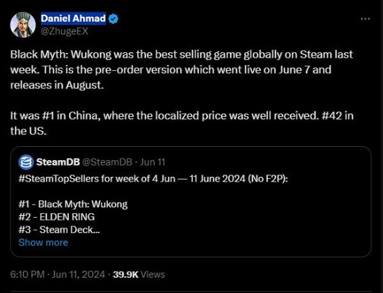 知名数据分析师Daniel Ahmad同样对此做了报道,指出这款游戏在中国大陆区销量为列第一,在美国则排在第42名,引起了外网玩家们的热议(未作筛选剔除)。