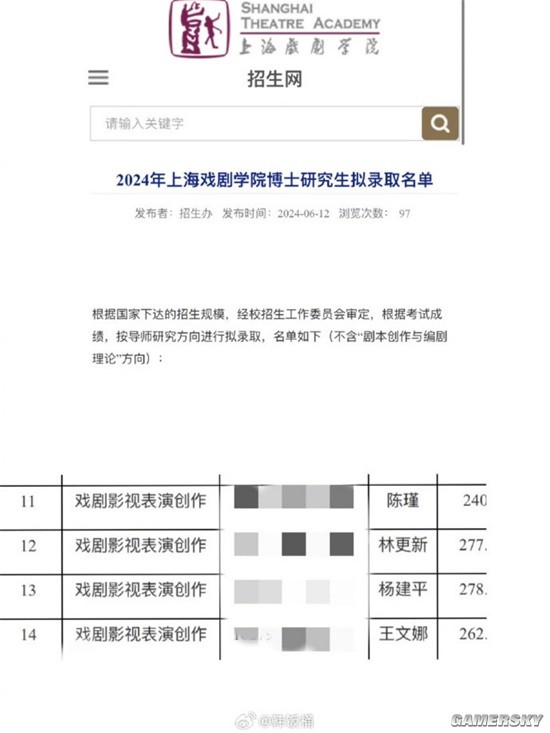 上海戏剧学院博士研究生拟录取名单显示,林更新申请的是专业学位,研究方向戏剧影视表演创作共录取4人,其中林更新以总成绩277.05分位居第二。