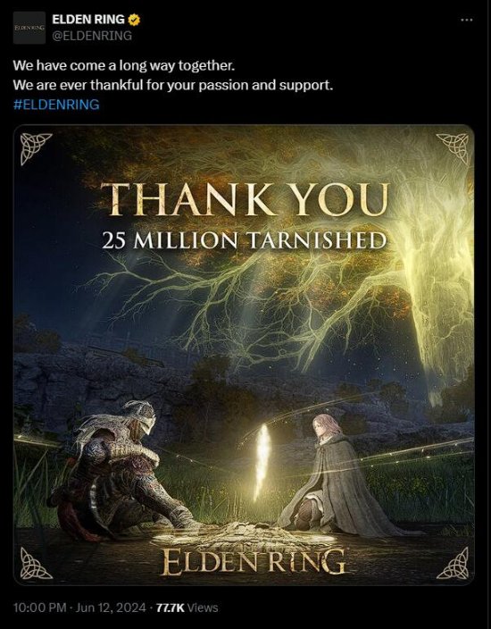 《艾尔登法环》官方今晚发文,宣布本作销量突破2500万!