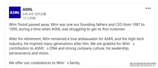6月12日消息,光刻机巨头ASML公司11日发文,悼念ASML创始人之一维姆·特罗斯(WimTroost)于6月8日逝世,享年98岁。