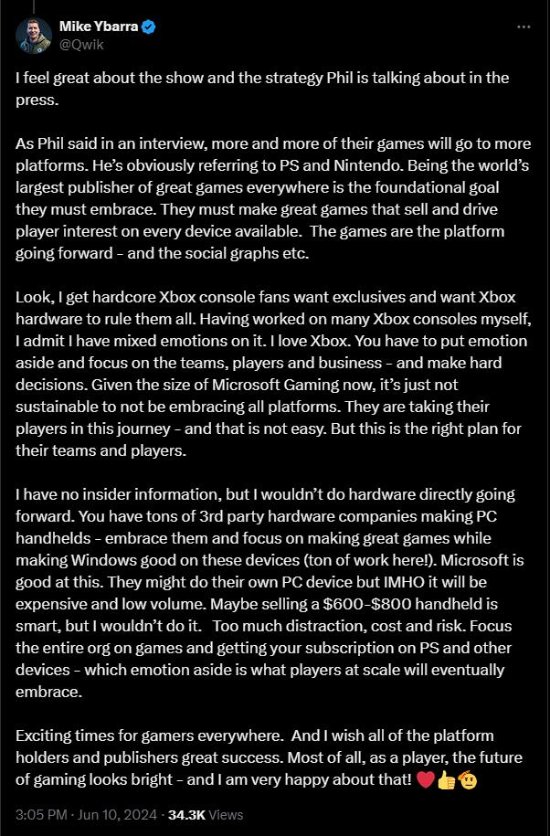 伊巴拉说:“你必须抛开情绪,专注于团队、玩家和业务,并做出艰难的决定,考虑到微软游戏公司现在的规模,不支持所有平台是不可持续的。他们正在带领他们的玩家踏上这段旅程,这并不容易,但这对他们的团队和玩家来说是正确的计划。”