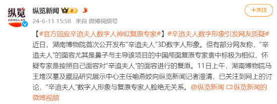 6月11日上午,湖南博物院马王堆汉墓及藏品研究展示中心主任喻燕姣向纵览新闻澄清:已关注到网上的讨论,“辛追夫人”数字人形象与复原专家人脸绝无关系。