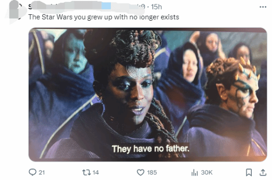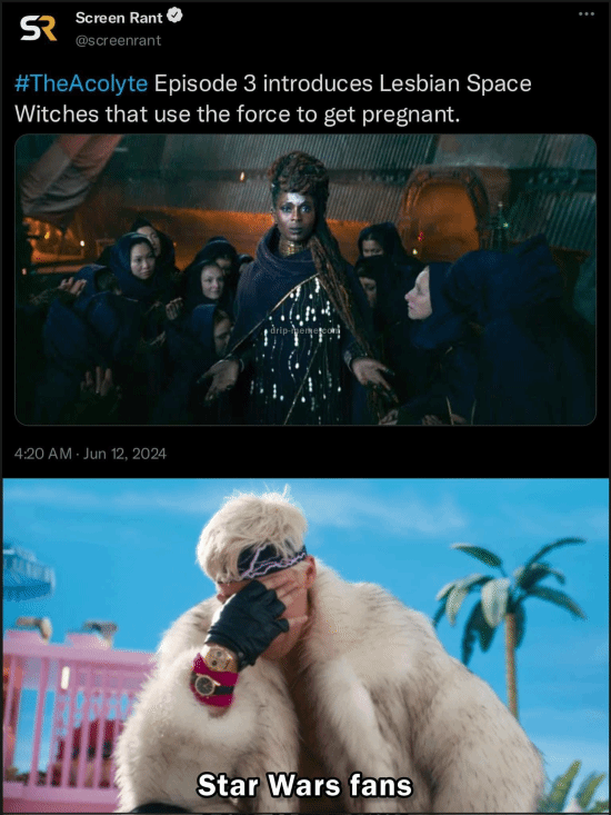 《星球大战》新剧集《侍者》第三集诞生了令人瞠目结舌的一幕:同性恋女巫们利用原力让自己怀孕。看完后很多粉丝表示三观尽碎,直呼《星战》系列已被迪士尼毁了。