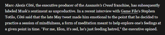 在接受Game File采访时,游戏的执行制作人Marc-Alexis Côté表示,五月下旬网上的那些批评让他情绪激动,以至于他决定练习正念,这是一种冥想形式,旨在帮助探索一个人在特定时刻的感受时间。“对我来说,埃隆,这很可悲,他只是在煽动仇恨。”