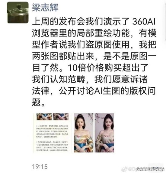 360集团副总裁梁志辉日前回应称,“争议图片系360AI浏览器重绘图,该图原创作者让10倍购买所谓‘原图模型’,这超出了认知范畴,愿意诉诸法律。”