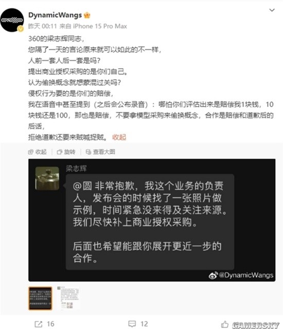 6月13日消息,360 AI新品发布会“被盗图人”DynamicWangs发微博喊话周鸿祎,要求公开道歉,赔偿1元RMB。
